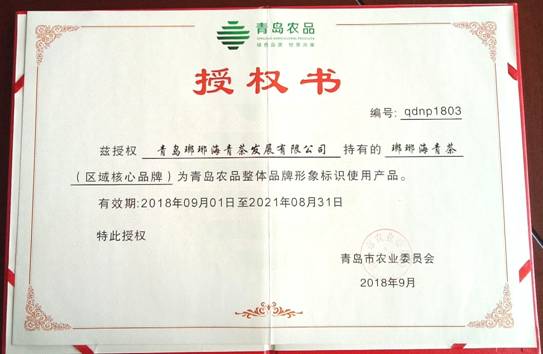 923,在西海岸首屆農(nóng)民豐收節(jié)上,青島市農(nóng)委宣布“瑯琊海青茶為首批“青島農(nóng)品”區(qū)域核心品牌,并頒發(fā)榮譽(yù)證書。