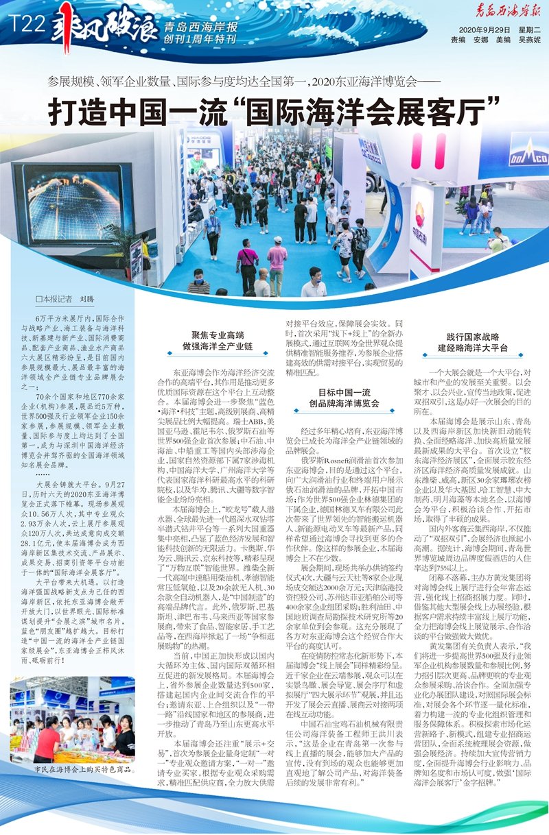 大展會(huì)鑄就大平臺(tái)。9月27日,歷時(shí)六天的2020東亞海洋博覽會(huì)正式落下帷幕。現(xiàn)場(chǎng)參展觀眾10.56萬(wàn)人次,其中專業(yè)觀眾2.93萬(wàn)余人次,云上展廳參展觀眾120萬(wàn)人次,共達(dá)成意向成交額28.1億元,使本屆海博會(huì)成為西海岸新區(qū)集技術(shù)交流、產(chǎn)品展示、成果交易、招商引資等平臺(tái)功能于一體的“國(guó)際海洋會(huì)展客廳”。