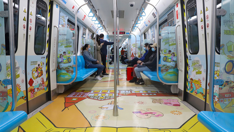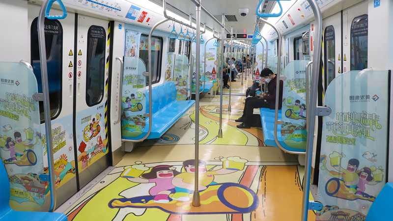 “地鐵專列利用車廂的立體空間,以插畫手繪風為主要設計風格,將金沙灘啤酒城IP形象——‘哈舅’作為靈魂人物,帶領乘客穿梭于六大主題車廂間,共同感受新區魅力,打造了場景化的品牌營銷,帶給乘客沉浸式體驗。”黃發集團策劃部工作人員趙益弘介紹。