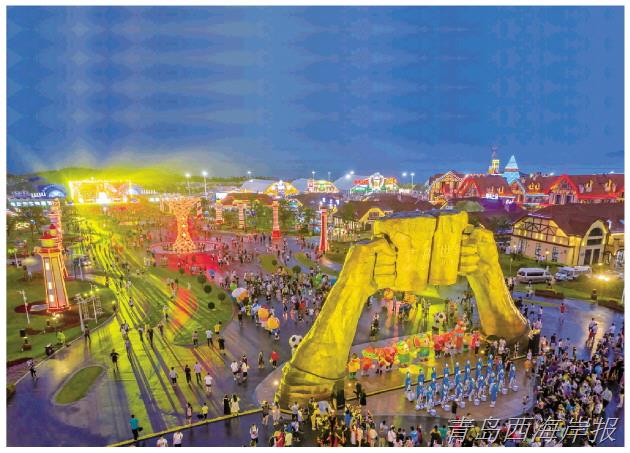 啤酒節期間,金沙灘啤酒城內花開全城、彩燈璀璨的景象令市民游客嘆為觀止。每當夜幕降臨,啤酒城精心打造的24組造型花藝組合、47組自貢彩燈燈組和10組藝術燈光互動裝置,營造了“白天游花海”“夜晚賞彩燈”的節日氛圍。